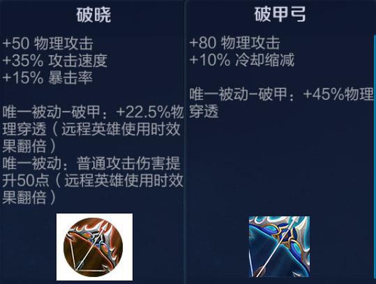 官方出破晓时的理由是老版的破甲装备破甲弓,对于许多后期射手而言,10%的冷却缩减用处不是太大,比如后羿、鲁班七号、黄忠、狄仁杰等英雄。虽然冷却缩减不会嫌多,但肯定不如攻击速度、暴击率这些属性对射手来的实在。大多数射手出破甲弓,完全是为了那45%的物理穿透。