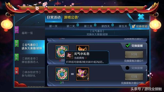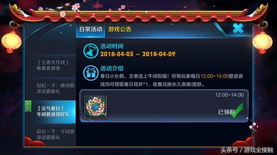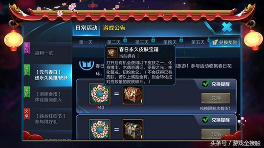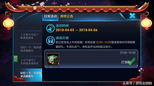 不过天美还有一个小小的福利就是每天的12:00—14:00会给1个花环和一个箱子,花环自然是让我们能更快的集齐;而箱子呢吸引我们中午记得登陆,有可能会给你666个铭文碎片,言外之意就是“中午也要登陆呦”,虽然我们都知道不太可能会得到,但是我们还是回去登陆的吧~