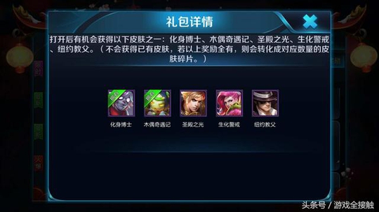 不过毕竟有句老话说的好,“想要得到什么,就要付出什么”,总体来说你和你的朋友花点时间就能够得到免费的皮肤/英雄,在游戏中还是比较划算的。这5款皮肤随机给一个,不过是从你没有的皮肤中给你,要是都有的话就只能给你皮肤碎片了。不过这几个皮肤中也就刘邦的—圣殿之光还好看点,其他的就。。。