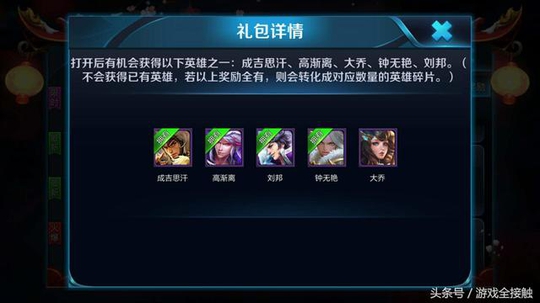 而抽取英雄的道理也是一样,先给你没有的,要是都有的话就换成英雄碎片发放给你。而这几个英雄呢一刀也就差大乔没有了,而且我也不太会这个英雄,所以还是去换皮肤比较划算。不过这里也有两个最近比较热门的英雄,就是成吉思汗和刘邦,如果没有这两个英雄的小伙伴们希望你们可以得到,毕竟这两位英雄还是挺强的,值得入手。
