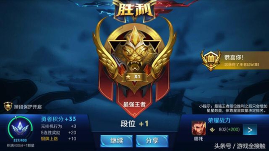 不过一刀挺高兴的就是在赛季末的时候,终于通过五连胜踏入了王者段位,虽然还是守门员,但至少面儿上好看啊O(∩_∩)O哈哈~不过真心要说一句哪吒真的能玩,尤其是对面后排不好切得时候,一突一个准~大家有什么上分的想法可以讨论一下哟!