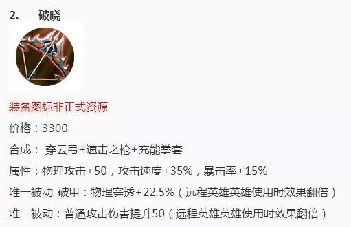 穿云弓作为破晓的小件,合成路径十分平滑,1100的价格就能让远程英雄拥有20%的物理穿透,而升级到破晓之后,物理穿透更是达到了恐怖的45%,不仅如此还有攻速与暴击率的加成。
