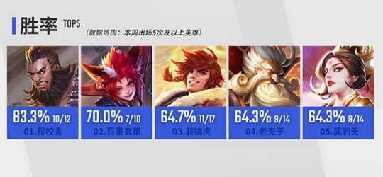 最能说明现在英雄强势的肯定还是胜率榜了,第一名果然就是在这周神勇发挥的程咬金。只有一出来基本都是赢啊,但还是有很多战队头铁不去先选他或者不去ban他,结果基本上都被他给打哭了,现在的野核裴擒虎和百里玄策是两个强大的英雄,有一些装备后都能发挥得很好。后面两名是单挑之王老夫子和土豪英雄武则天,对队伍也有很大的贡献。