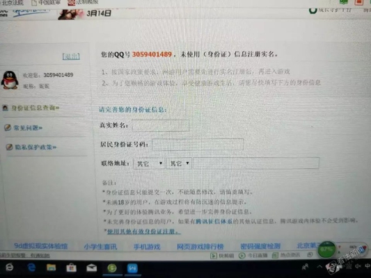 随即,记者注册了需绑定“实名注册和防沉迷系统”的QQ号码,登录后,了解到游戏者需要实名认证,填写姓名和身份证号码和联系地址。