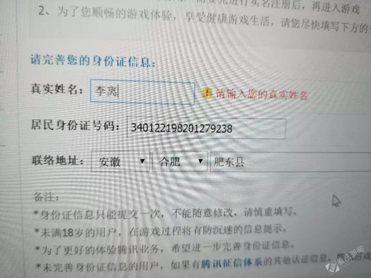 记者注册了需绑定的QQ账户,在防沉迷页面登录后,记者输入了自己的真实身份证号码,但姓名一栏输入“李离”二字,结果,这样的“实名认证”也顺利通过了。