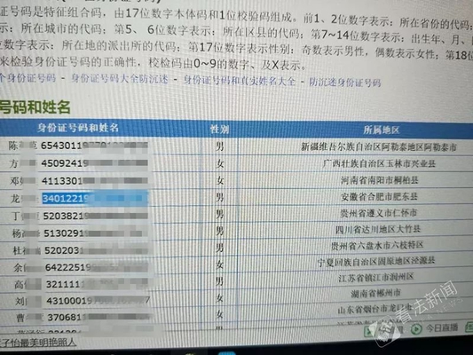 记者点开“防沉迷满18岁的身份证号+姓名大全”网页,进入后可看到一个Excel表格,该表格里有身份证号码、姓名以及所属地区等个人信息。该页面还有文字说明称,以上身份证号码所属年龄均为18岁以上,均已通过校验。