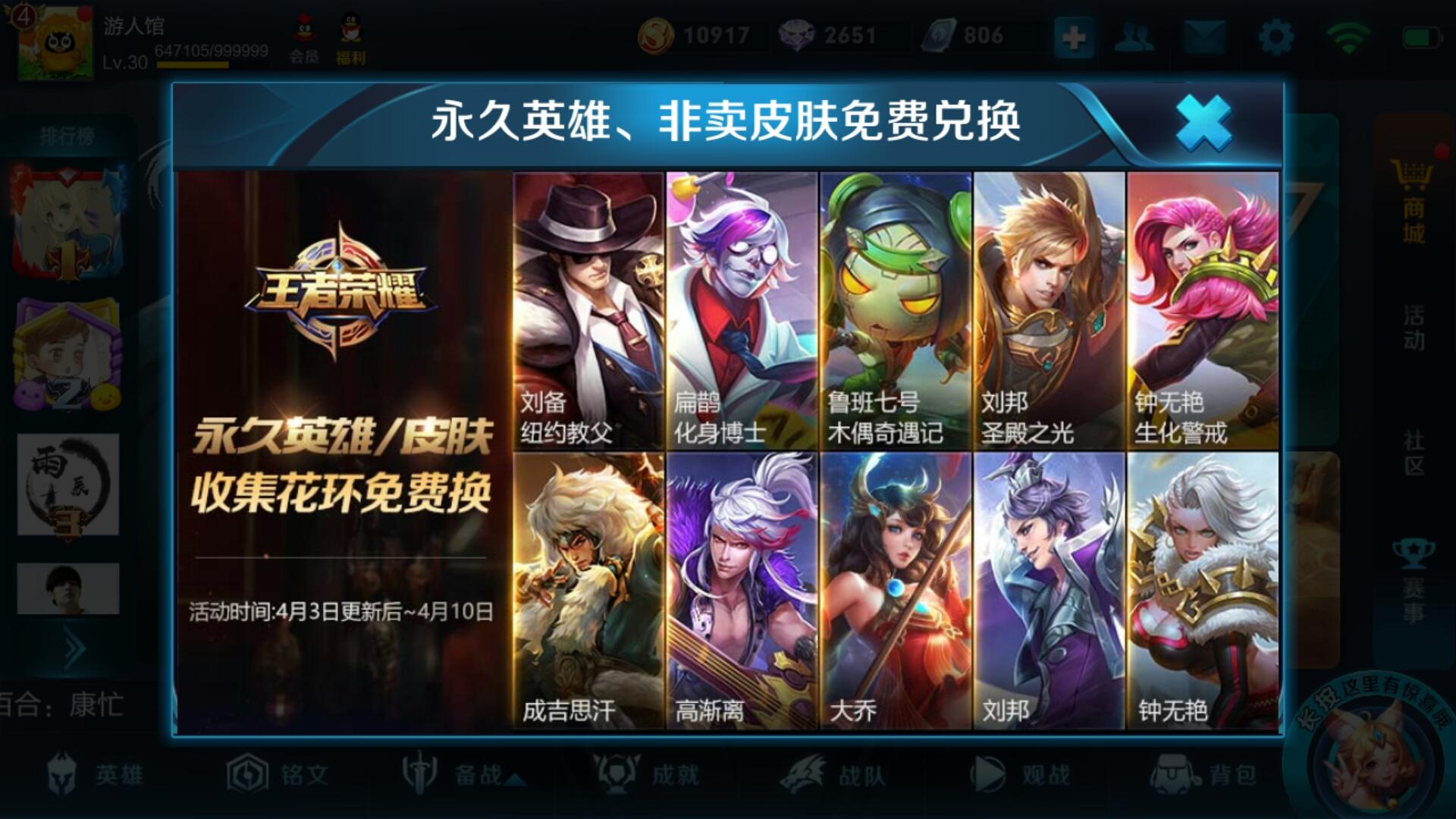 我们再来看看这些皮肤和英雄的性价比吧。皮肤方面,木偶奇遇记,圣殿之光,以及生化警戒,都是288点券,而前面两个皮肤则是限时皮肤,很多时候想买都买不到,所以说有能力的小伙伴可以先把后面三个皮肤搞定之后,再去换这个奖励,就可以百分之百的得到前面两个皮肤了。