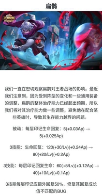 第二个被削弱的英雄是扁鹊。扁鹊其实已经不算是严格意义上面的辅助英雄了,这一波削弱的主要是扁鹊的治疗能力。说实话如果这样削弱的话,估计没有几天,扁鹊又要没有办法玩了。