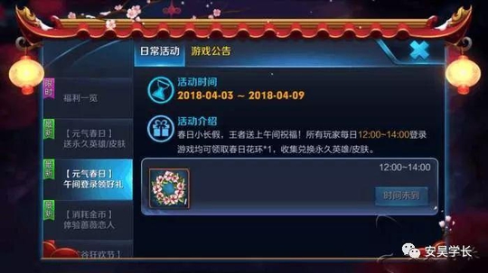 所需要的游戏道具那就是春日花环了,怎么获得这个春日花环呢?如下,每日登录可以获得该道具,在活动期间也就是4月3日至4月9日,每日12点至下午2点登录的小伙伴们可以获得一个春日花环,如果每天都在这个期间登录,那么一共就能获得7个春日花环。