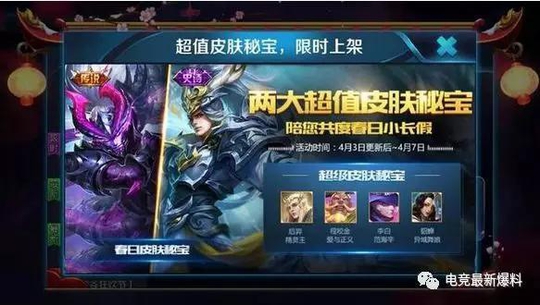 这第三个活动其实并没有什么看点,对于平民玩家们来说这样的活动不上也罢,但是对于土豪玩家那就另当别论了。虽然说这个活动是限时上架的,但是具体开出来的皮肤是永久的还是体验卡,天美并没有明确指出,即使是永久皮肤,那也都只是一些普通皮肤,对于这些土豪玩家么来说根本没什么。