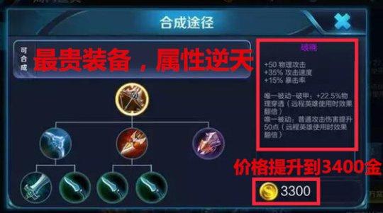 总价3400金的最强神装, 刷新了王者荣耀装备价格的新高,足以见得射手大后期将会是怎样一个秒天秒地的景象。