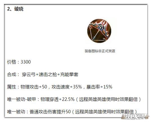 而且破晓的穿甲属性与破甲弓不叠加,基于破晓属性上的优势,射手以后必然会淘汰破甲弓装备而选择破晓。