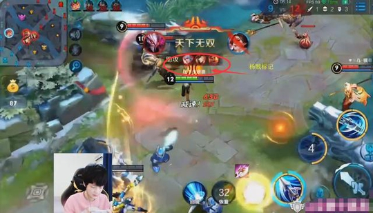 而后到达战场直接位移技能全开,对着有人的敌方就是过去打几下,但是来之前还是满血的韩信在一技能还没放完就掉了快一半的血了,并且韩信并没有先打杨戬,而是先奔向残血的马可波罗,这样就被杨戬已经标记好了,只是还没触发一技能血越少伤害越高的斩杀效果,应该在等韩信残血。