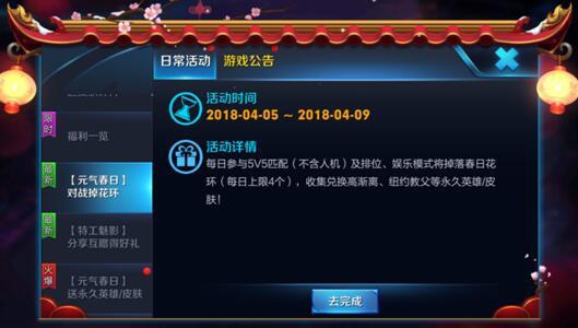 在4月5日到4月9日之间,每日参与5V5无论是匹配、排位还是娱乐模式都将凋落春日花环,收集了这些花环可以兑换高渐离、纽约教父等永久英雄或者皮肤,是不是很心动,赶紧收集花环吧!