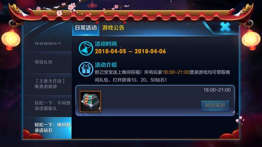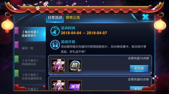 1. 在2018年4月4日到2018年4月7日之间,活动期间每日 充值均可以获得皮肤碎片、30点券优惠卡、铭文碎片等等奖励!所以说想要充值的玩家在这个时间段充钱是最划算的,既可以享受平时的待遇,又可以有这么多的福利免费领取,还在等什么,快快行动起来吧。