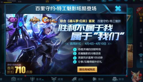 百里守约新皮肤特工魅影炫酷登场,发行首周原来要888点券现在只卖710点券,想要入手百里小哥哥皮肤的玩家赶紧行动起来吧,到10日活动就结束了,会恢复原价的。另外如果分享或者互赠的话会有额外的好礼相送。