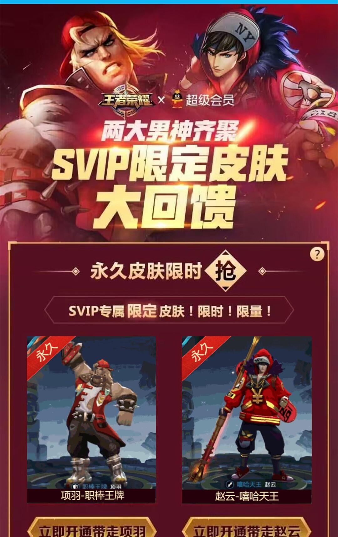 这次的SVIP回馈皮肤还是项羽的职棒王牌和赵云的嘻哈天王,土豪朋友一定要记得操作时先点自己人头,进入会员中心,再进入活动页面,通过这样的方式才能得到SVIP专属的限定皮肤,并且这个皮肤是限时和限量的,如果没有看到可以得到这两个皮肤的选择。那就千万不要继续了,免得竹篮打水一场空。