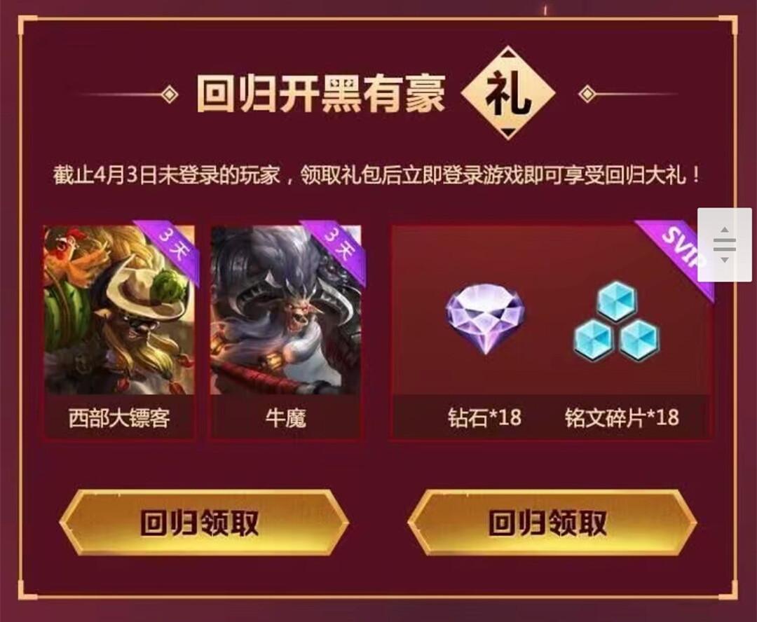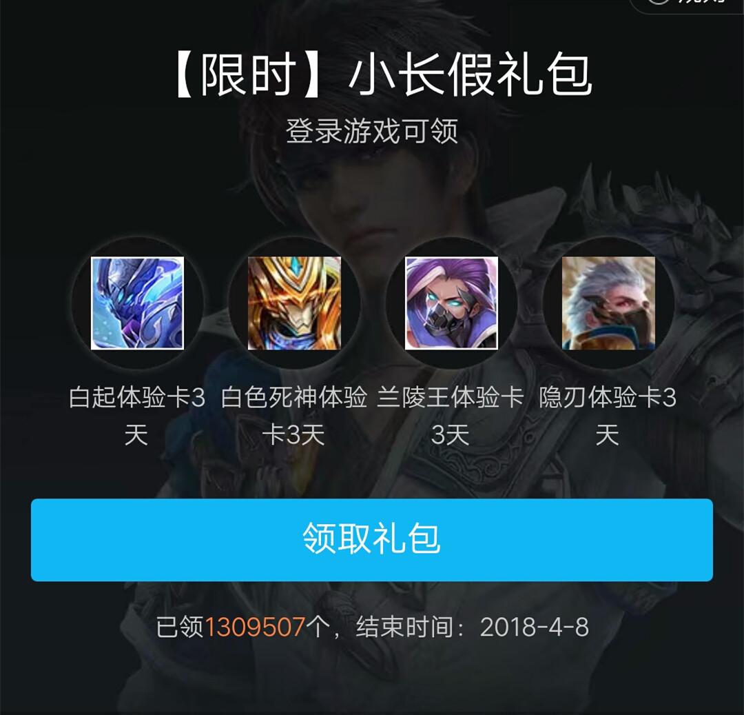 这个活动目前已经发放了100多万了,从今天到4月8号都可以领取。其中有白起和他的皮肤三天,以及兰陵王和他的皮肤三天。白起这个英雄现在还是蛮强势的。没有这个英雄的小伙伴可以趁两天来玩一玩练手,说不定之后就是你的本命哦,至于兰陵王,在拿人头方面有得天独厚的优势,击杀狂人可以来体会一下。