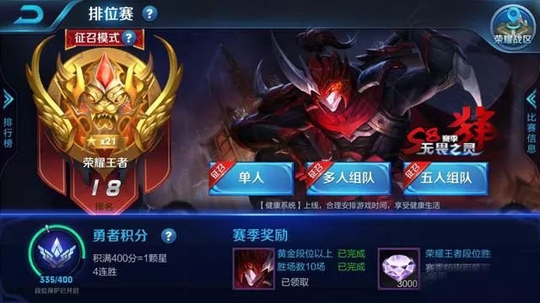 王者荣耀排位赛如果连胜3场以上,胜利后段位星星就会增加两颗,之后连胜也同样会增加两颗星星,直到连胜被终结为止。综合以上:王者荣耀中“荣耀王者”就是“最强王者”,只是荣耀王者是中前面前100名,边框不同所有不同。