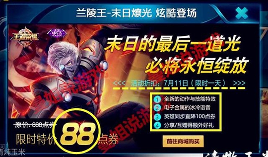既然这么好看的机甲皮肤,那么是什么时候才上线呢?别急,这款皮肤即将上线,仅售8.8,也就是88点券哦。是不是感觉很便宜呢,史诗级皮肤竟然折扣是8.8元。而且,这款皮肤将在7月份上线正式服,帅气的外表是不是觉得非买不可呢?其实,小曼要跟大家说一件事,那就是这一切都是假的,假的,假的。哈哈,是不是感觉好气,这只是绘图大神自建的兰陵王一款皮肤。但是,不知道天美看到会不会考虑上线一款兰陵王机甲皮肤呢,毕竟机甲皮肤已经很久没有出了。