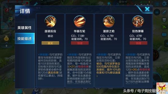 技能方面,也是得到了很不错的改良。被动连锁反应,使用普攻和技能对目标连续造成10次伤害以上,会打出120点真实伤害。一技能华丽左轮,马可波罗朝指定方向连续射击,额外攻速会增加子弹数量,造成更多伤害。二技能漫游之枪,马可波罗朝指定方向闪烁,提升攻速和移速。三技能狂热弹幕,马可波罗朝指定方向闪烁,之后释放狂热弹幕。