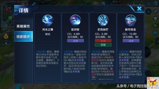 我们再来看一下露娜的技能,这次技能也是全新升级。被动月光之舞:每20点法强提升1%攻速,1、2技能用星光标记目标。一技能弦月斩,露娜朝指定方向释放星光造成伤害。二技能炙热剑芒,露娜向周围释放6把夜幕投刃,造成伤害和减速,之后投刃会收回,也会造成伤害和减速。三技能新月突击,露娜朝指定方向突击,对经过的敌人造成伤害,过程中引爆星光标记技能会刷新,并且被标记目标造成额外伤害。