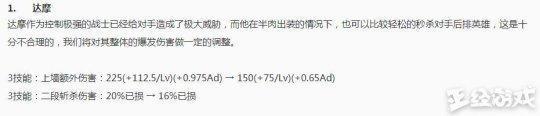 而在4月1日的更新中,还是有一大批的英雄惨遭了削弱。其中就包括了达摩、苏烈、黄忠、孙悟空和姜子牙。在调整中,对于达摩的3技能的改动十分大,令其伤害下降严重。