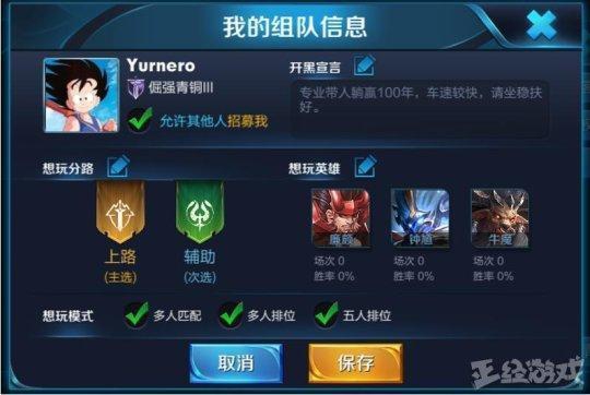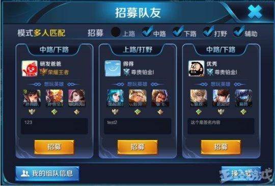 每个玩家提供了一张“组队卡”,玩家可以在此填写自己擅长的位置和英雄,想玩的游戏模式,以及自定义的个人介绍。同时在在5V5匹配、多人排位和五人排位的房间内,队长玩家可以通过“招募队友”功能来寻找合适的队友。