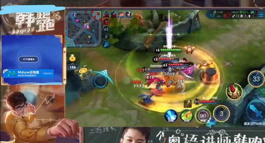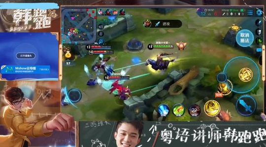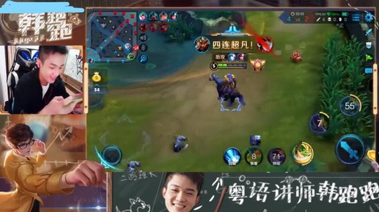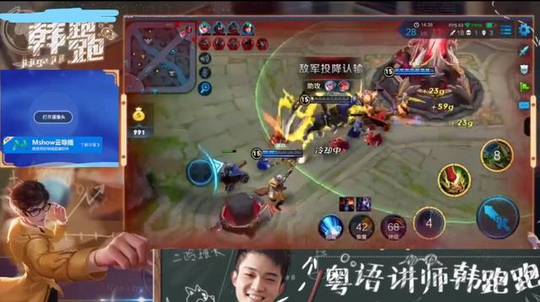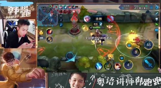 这是一场企鹅电竞主播韩跑跑的比赛,队友挂机,四打五打到对方投降认输。主播跑跑使用的是关羽,先是开局利用关羽快速的支援,到中路支援队友一个绕后大招,将敌方三人推入防御塔下,并拿下三杀,然后快速跑到下路,以移速快的优势,躲掉敌方狄仁杰的大招,并将其反杀获得四杀超凡。