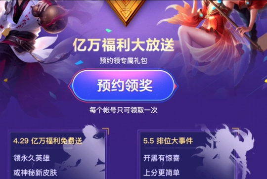 目前只有一个预约领奖的点击入口,每个账户只能领取一次奖励。下方是两个活动的预告,分别是4月29号开启的福利活动,看起来应该是通过糖果屋或者类似的搜集碎片兑换的方式,因为是有几率获得新皮肤,所以比较大的可能是小概率使玩家中奖。第二个活动是参与排位领取奖励,估计是当天进行排位次数领取道具。