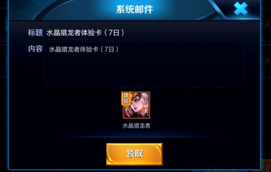 预约后可以从邮箱中领取到奖励,分别是花木兰的水晶猎龙者皮肤七日体验卡和五十个铭文碎片。