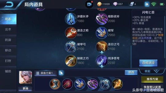 在饭饭君看来,百里守约不管是前中后期,最重要的都是他的普攻技能,第一件攻速鞋是必须的,有了这双鞋子,在线上就不会有英雄敢跟你单挑,即便是辅助游走你一样可以强势压制上单,第二件就是末世,将攻速最大化,这时候你会发现普攻的伤害远高于技能了,而且普攻节奏会非常顺手,破军则是单纯的为了增加技能伤害,暗影战斧其实适合在末世之后直接出,不过为了最大穿透效果,这两件护甲穿透的装备都是要出的,最后就是增加攻速的电刀,如果对面输出较高复活甲也可以。