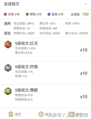 既然我们的百里守约要走普攻流派,那攻速肯定是少不了的,有的新手玩家可能会认为红月5%的暴击浪费了,其实不然,百里的被动可以将5%的暴击率转化为15点伤害,这对于前期的百里效果非常不错,要知道狩猎和隐匿也只是16攻击力和10%攻速的区别,所以这可将红月的两个属性完美的发挥到极致,还有比16%攻速和15点攻击力的铭文性价比更高的么?绝对没有。蓝色我们还是选择带攻速,绿色则是普攻必备的护甲穿透了。