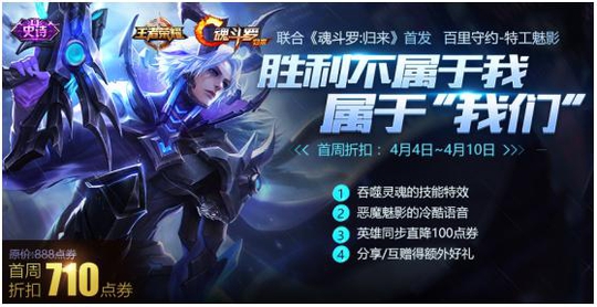 首先就是更新给我们带来的新皮肤了,这款皮肤是百里守约的,名为特工魅影,拥有吞噬灵魂的炫酷技能特效、以及恶魔魅影的冷酷语音、同时英雄同步直降100 点券、分享/互赠可得精外好礼,身为一款史诗皮肤,恶魔魅影首周的折扣售价也是同样的710也就是4月4号到4月10号期间,在这期间英雄百里守约直降100点券,另外和好友互赠还可以免费获得长城守卫军的回城特效哦。