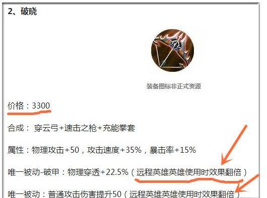 属性太全面了,物攻+50、攻速+35%、暴击+15%和物理穿透22.5%(远程翻倍!!)全是射手最需要的属性!