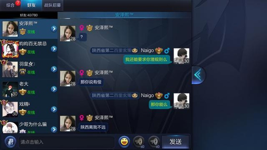 玩家这时突然间就懵逼了,不过反正女玩家都这样说了,玩家就问了我还能要求你潜规则吗?女玩家说那你说有偿,玩家再问那你能吗?女玩家回了一句陕西离我不远,看到这里玩家心里暗爽,这句话等于这个女玩家默认可以.