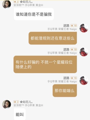 后面玩家就尝试各种看女玩家的照片等等,后面女玩家表示先上钻石再说,谁知道玩家是不是骗她,后来玩家急了直呼都能潜规则了还在意这些吗?后面又说就一个星耀随便就能上了,最后再问了一句,你能喘吗?女司机的回复让玩家整个人都脸红了,女司机回复:能叫!