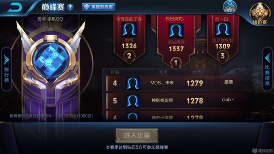 巅峰赛是针对高端玩家而专门开辟的赛事。只有达到过王者段位,且当前段位不低于星耀二才可以参加。巅峰赛只有在每晚20:00——23:00才可以参加,所以想要参加巅峰赛, 先定一个小目标,上个王者吧~