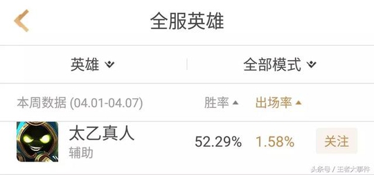 太乙真人上周的出场率仅为1.85%,排名倒数第一。