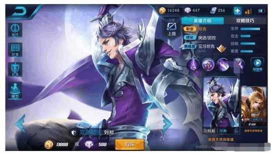 刘邦,一个硬邦邦的男人,大招传给谁很关键,同时还有嘲讽技能,操作简单,但是要经常看小地图和队友的位置,同时要经常准备好大招为开团做最有力的保障。