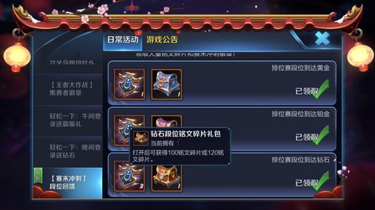 其次当玩家段位达到最高钻石时,可以领取三个铭文碎片宝箱,玩家保底可以获取225铭文碎片,虽然并不多,但是Aggro君看来,比几率开出2018铭文碎片可来得实在多了。