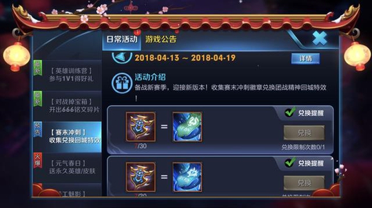 王者荣耀正式服更新后上线了一系列的福利活动,活动的主题为赛末冲刺,玩家可以通过日常的对战(包括匹配、娱乐模式和排位赛)掉落任务道具和奖励,同时达到指定段位就可领取可观的铭文碎片奖励,同时团战精神回城特效的兑换也二度开放了。