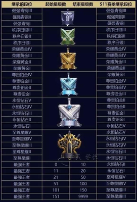 新英雄、新皮肤都给大家介绍完了,那么接下来就是最主要的了,那就是段位继承,每一次赛季更新都会有的,大家领取段位钻石奖励之后就会发现自己掉段了,这就是新赛季开始的继承。以下就是S11赛季的段位继承图,从中我们就可以了解到各大段位的继承情况。
