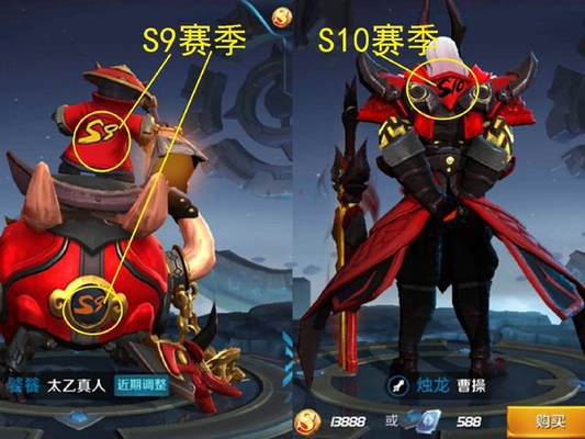 从S7虞姬的黄金四级皮肤之后,S8开始的白起以及S9的太乙到S10的曹操就更换成无畏之灵系列皮肤。那么我们先来看看S9的太乙,他的后背以及坐骑后背分别都有S9数字的赛季标志。曹操后背也印着S10赛季的标志。黄金系列皮肤引用的是中文,然而到无畏之灵系列皮肤就直接用数字。