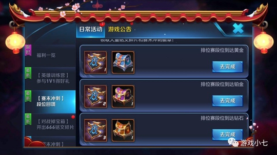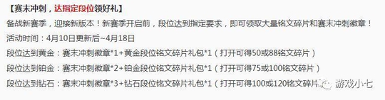 二、段位奖励,4月10日到4月18日之内,达到黄金、铂金、钻石(超过)等段位的小伙伴,还可以获得相应的段位铭文碎片礼包1个,不同段位的小伙伴,打开礼包获得的奖励数量不一样。(达到个钻石段位你都可以全部领取)