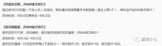 三、还有些小活动,每天对局会掉落3个赛末冲刺宝箱,运气好能开出666铭文碎片,同样看运气开666铭文碎片的活动还有登陆就送周末狂欢福袋,能开出来算你牛。(都是垃圾活动,没铭文的小伙伴可以去尝试下)