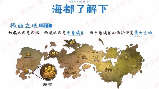首先先了解一下全新版本的英雄来源地--海都~大家可以看到王者峡谷、长城护卫队、大唐盛世的位置;而在峡谷的西边则是勇士之地,而勇士之地的下面就是下个版本的主源地--海都!