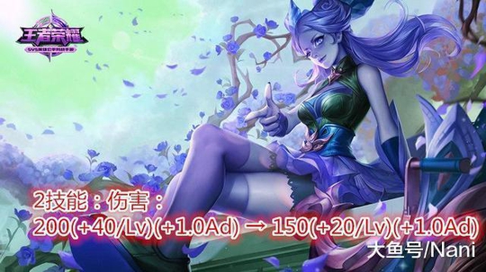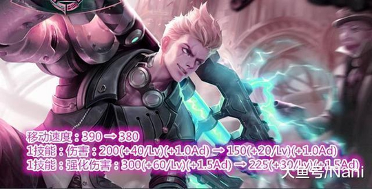 主要降低了一技能的伤害值和移动速度。移动速度由原来的390降低至380.