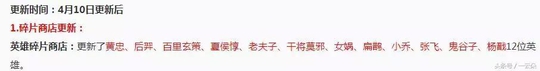 在本次更新中,碎片商店中的英雄也得到了更新替换,他们分别是射手英雄:黄忠、后羿,刺客战士英雄:老夫子、百里玄策、杨戬,坦克英雄:夏侯惇、张飞,法师英雄:女娲、扁鹊、干将莫邪、小乔,以及辅助英雄:鬼谷子。
