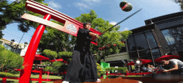 他们把水果抛到空中用刀切开,体现刀的锋利。